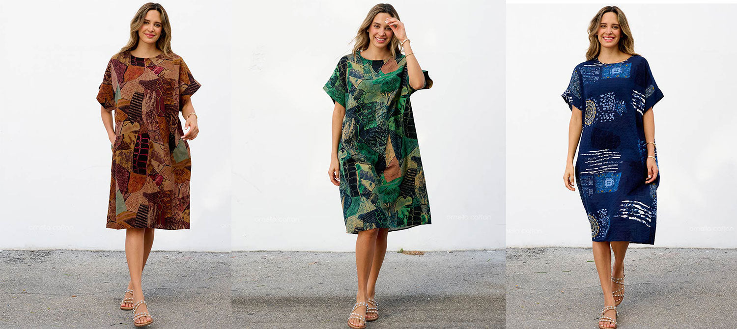 Quick answers to questions about the size and fabric of the caftans and delivery.